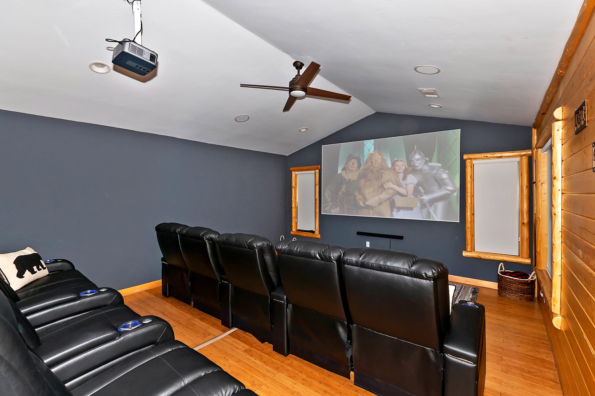Black Rock features a private home theater with 10 leather recliners, a projector screen, and a popcorn machine, creating the perfect cinematic retreat in the mountains. This luxurious cabin blends upscale comfort with world-class entertainment for an unforgettable stay.